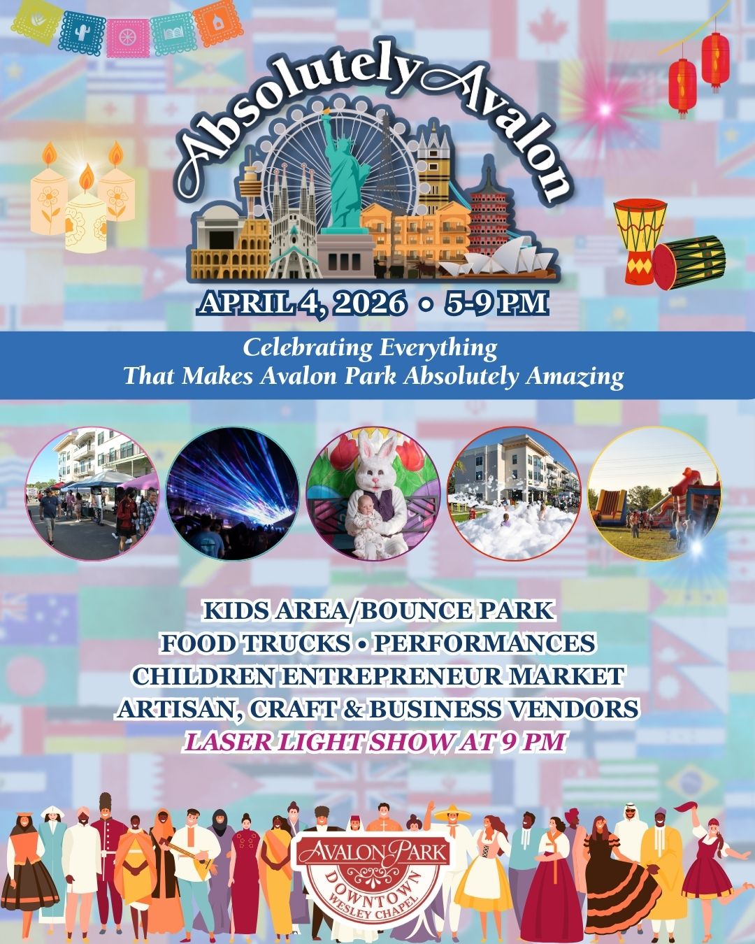 Join us for the 2025 Absolutely Avalon event! The festivities will kick off on Saturday, April 4, 2026, starting at 5 p.m. Located in the heart of Avalon Park Wesley Chapel! There will be food trucks, vendors, a complimentary bounce park, and more! This event is free and open to the public.