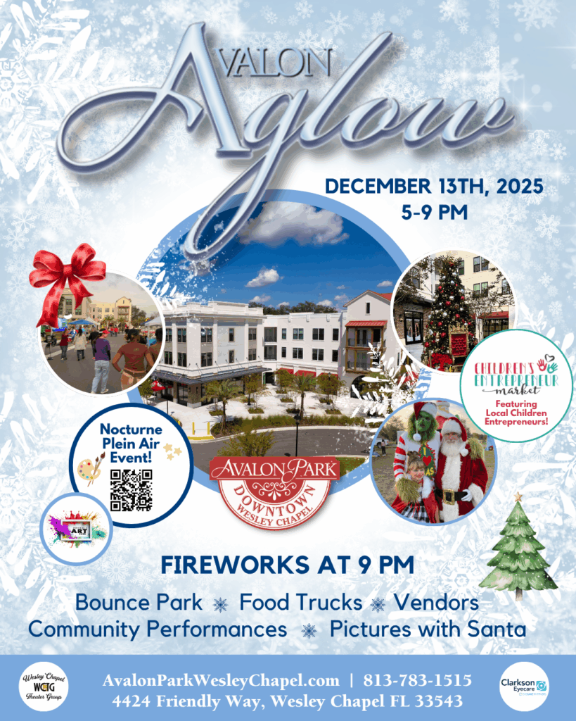 Join us for the annual Avalon Park Avalon Aglow event, a fun-filled holiday celebration! The festivities will kick off on Saturday, December 13, 2025, starting at 5 p.m. Located at 4424 Friendly Way, in the heart of Avalon Park Wesley Chapel! There will be pictures with Santa, REAL snow, vendors, live music, a bounce park & MORE. Followed by a fireworks show! Get ready to dance and have fun. This event is free and open to the public.