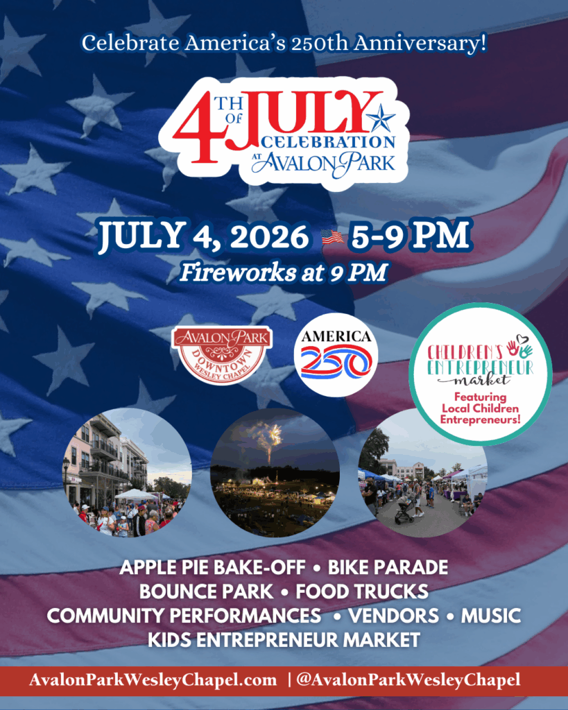 Join us for the annual Avalon Park Fourth of July Celebration! The festivities will kick off on Saturday, July 4, 2025, starting at 5 p.m. Located in the heart of Avalon Park Wesley Chapel! There will be fireworks, food trucks, vendors, a kids area bounce park, and much more! The Fourth of July Celebration event is FREE and OPEN TO THE PUBLIC.